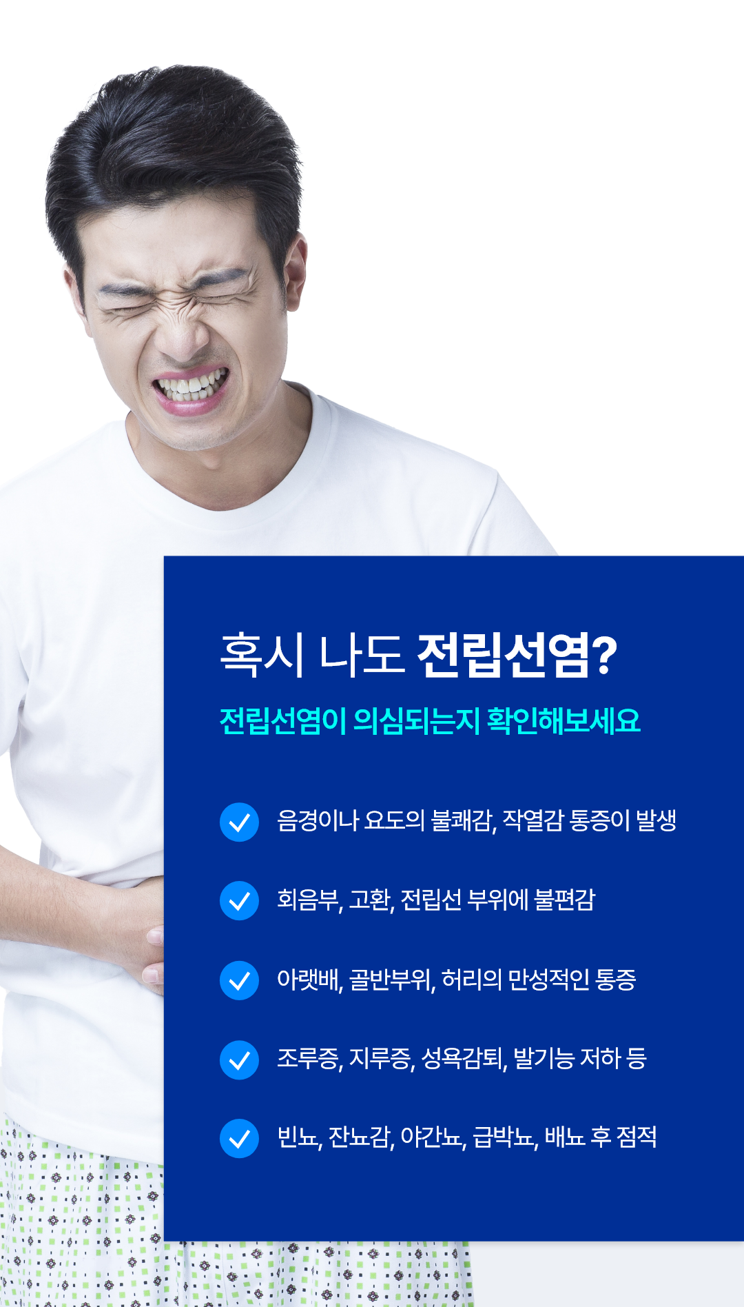 전립선염은 배뇨 장애(통증, 잦은 배뇨, 잔뇨감)와 하복부, 고환 통증, 성기능 문제(사정 시 통증, 발기부전) 등을 유발합니다.